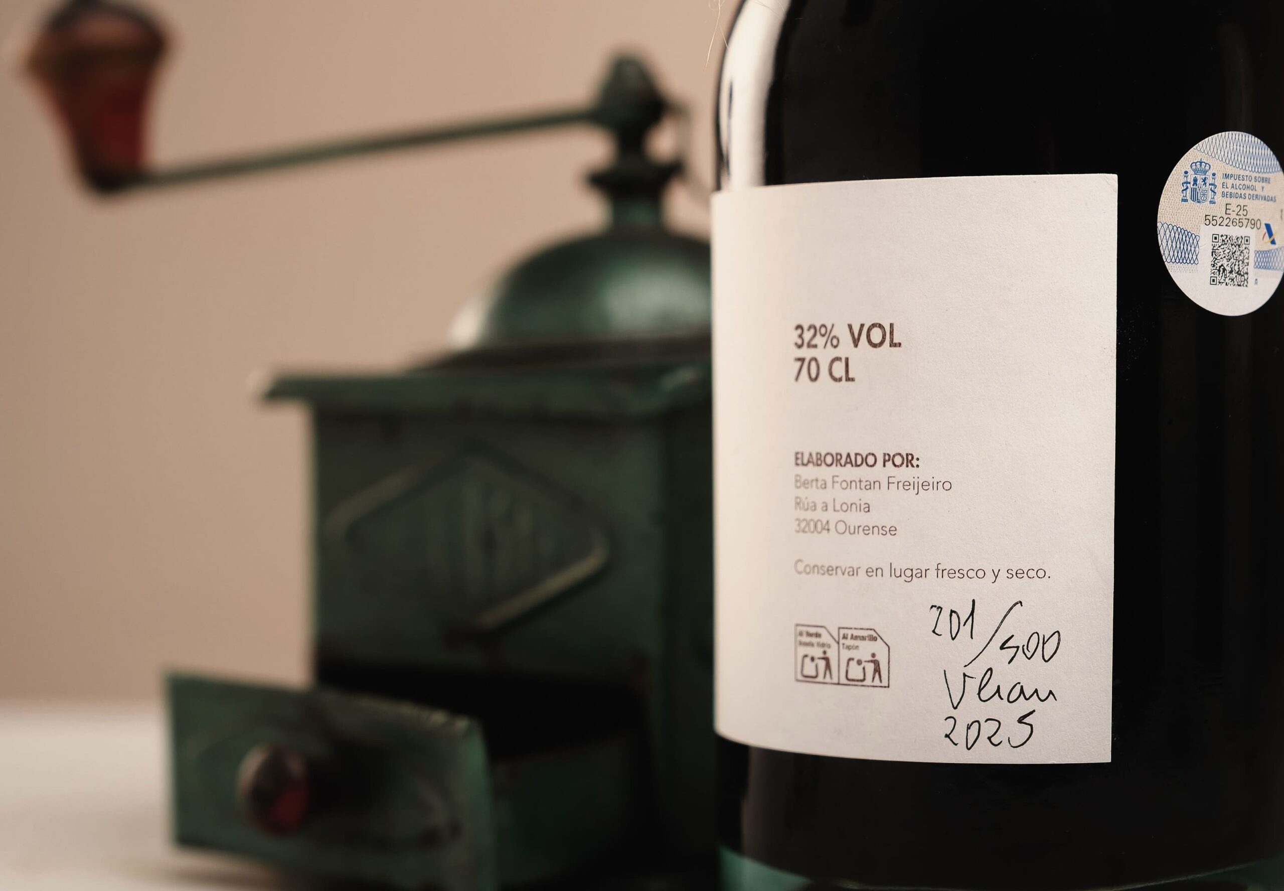 A produción realízase en pequenos lotes para garantir un control absoluto en cada fase. O uso de vidro reciclado, corchos naturais con carbón activo e unha presentación sobria e elegante reflicten o carácter do proxecto: respecto polo produto, polo territorio e polo oficio.